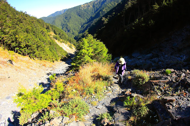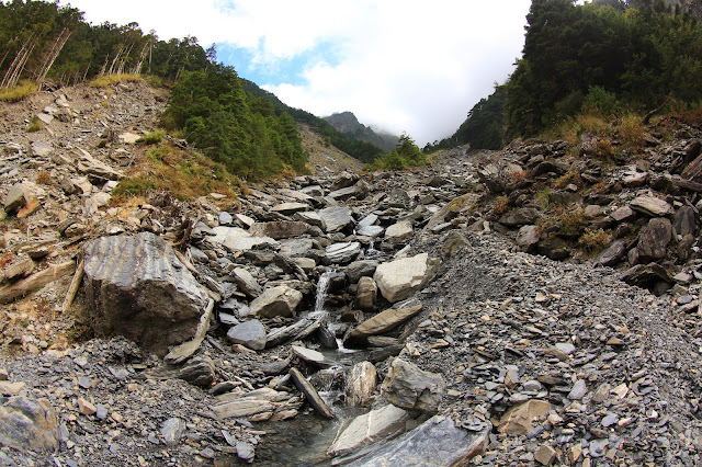 攀登中央尖山的秘訣,要在太陽照進碎石坡之前上到主東鞍部。因為等到太陽照進碎石坡之後,第一很熱、第二上攀很刺眼。早上七點左右,等到天色亮一點,中央尖溪谷中的光線充足一點後,我們整裝出發。從中央尖溪木屋出發後,沿著中央尖溪向上行,水還是有一點大,涉水的時候最深大概還是可以到小腿肚附近,大概是雨鞋的極限了,不過小心一點前進,還不至於進水。