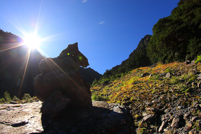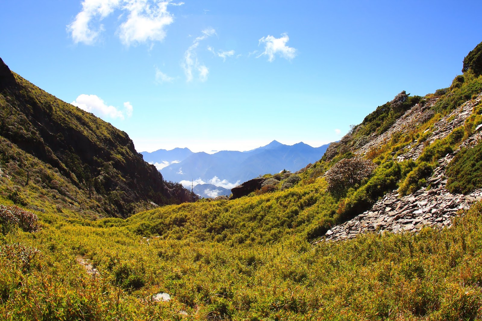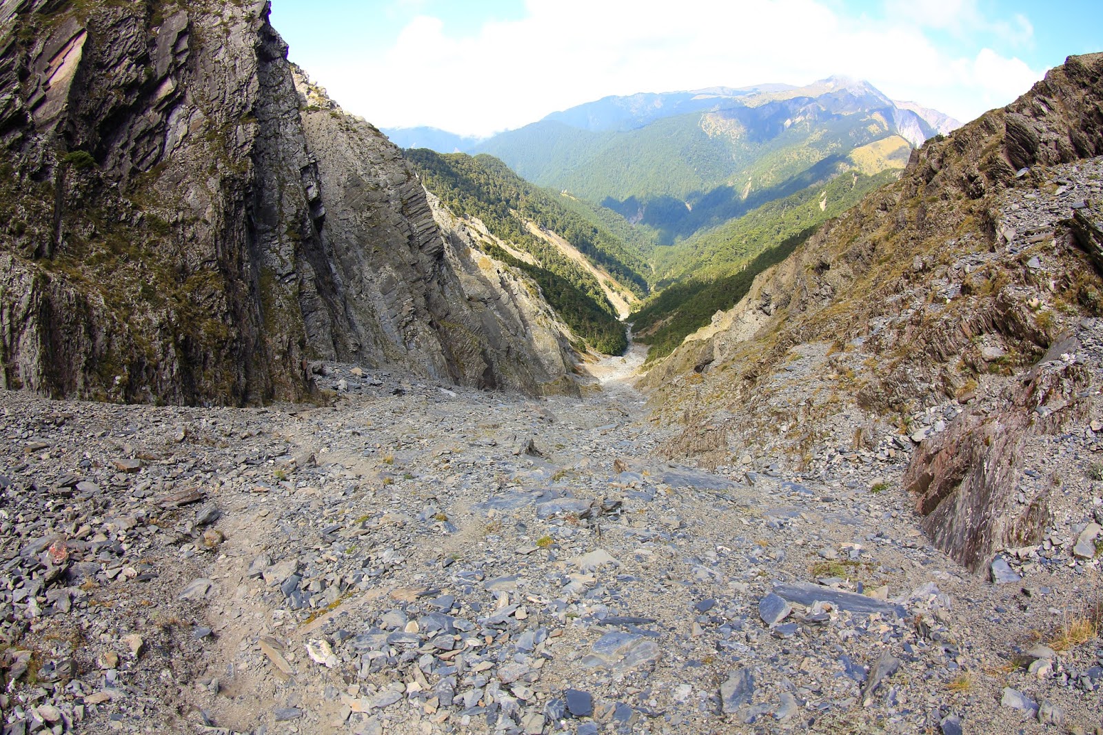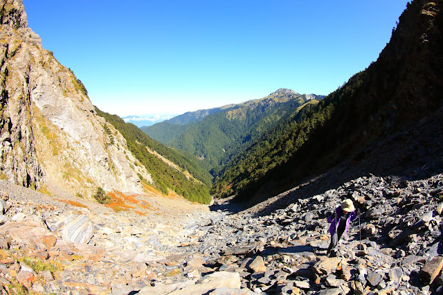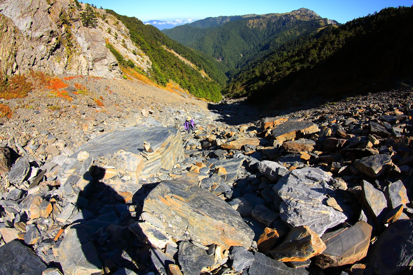 我們坐在主東鞍部,回望中央尖溪谷,想不到我們只花了三個小時就爬上這要命的碎石坡,比我預期得還要快,可能是因為我們比較晚出發,沿路都不敢休息,一口氣直接拚上來。在主東鞍部這邊曬太陽真的是太舒服了,一不小心就休息太久。一回神已經快11點了O.O