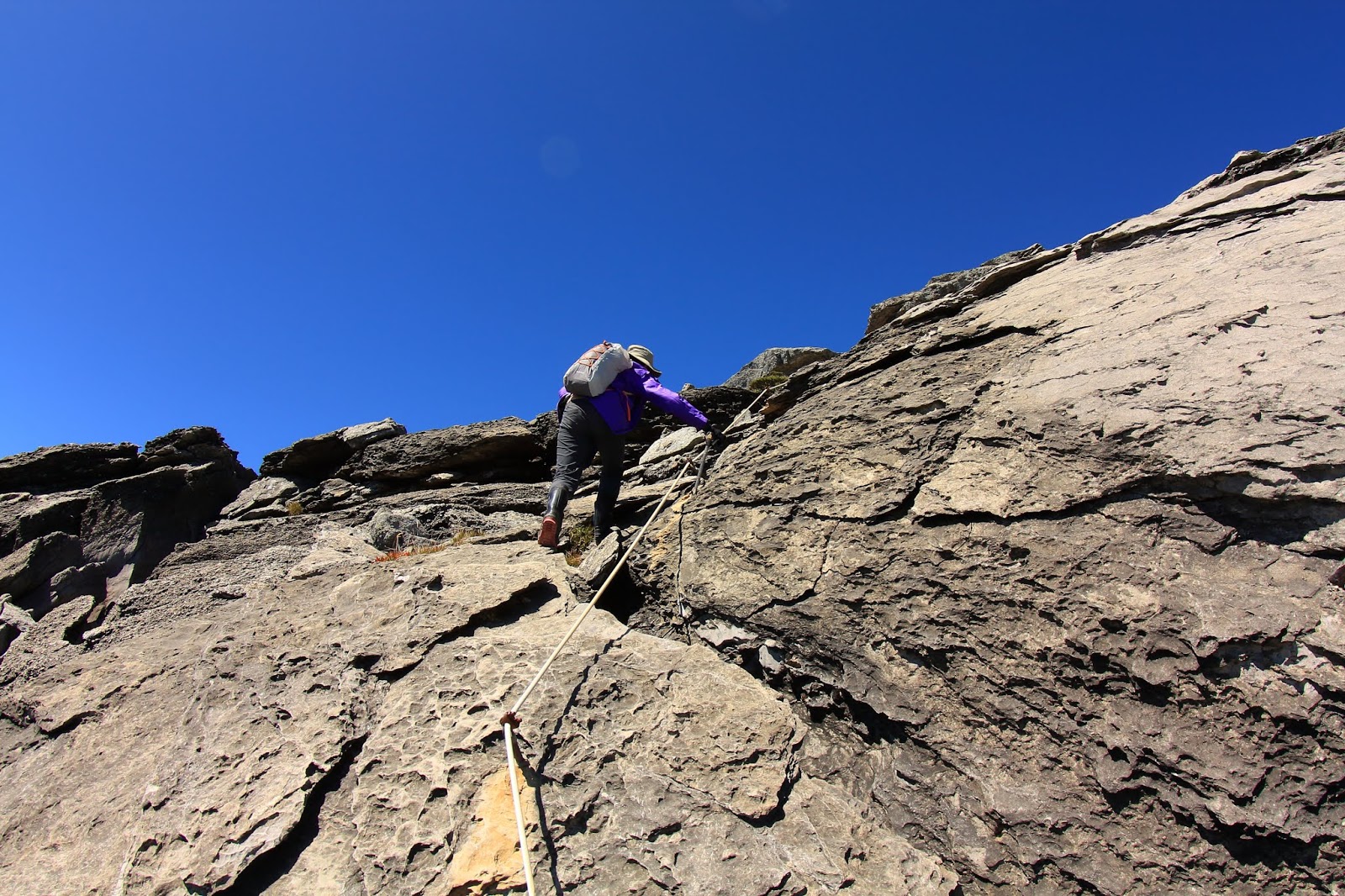 從中央尖溪山屋出發後不久,通過溪水左側岩壁的第一段高遶,這段高遶很長,有拉繩,但還是要小心,這裡如果失手的話應該會摔得不輕。接下來大概就是看著疊石找好過溪水的點,不停的在溪水中左切來,右渡去。接下來遇到一個比較機車的地形,大概就是岩壁旁邊的一段地形,高低落差有一點大,需要藉助幾根摩擦係數接近於零的木頭,岩壁上方有一個小瀑布,不斷的灌水下來,腳下處理木頭花的時間如果越長,被灌的水越多。