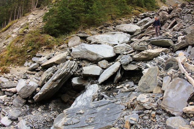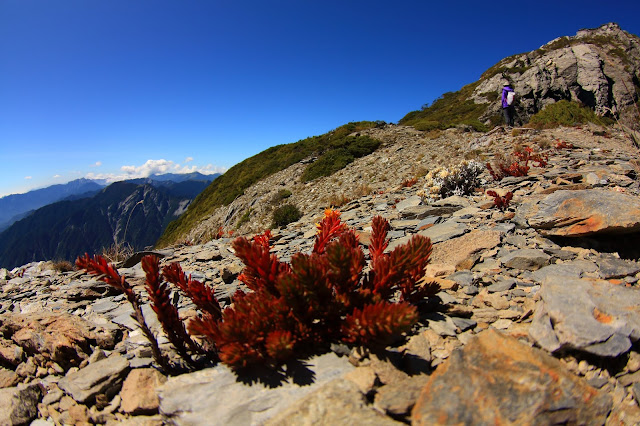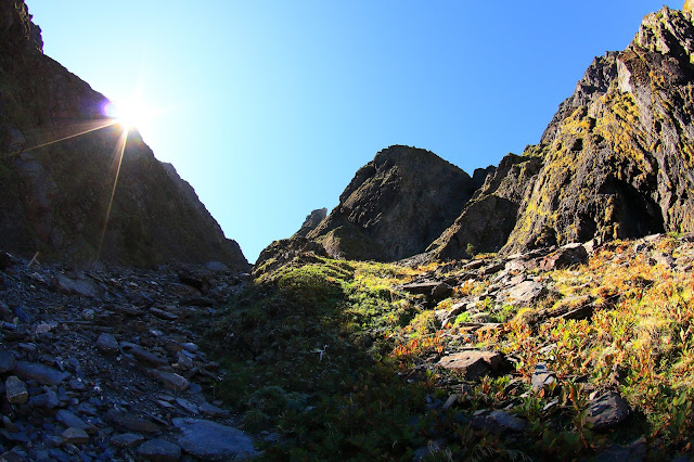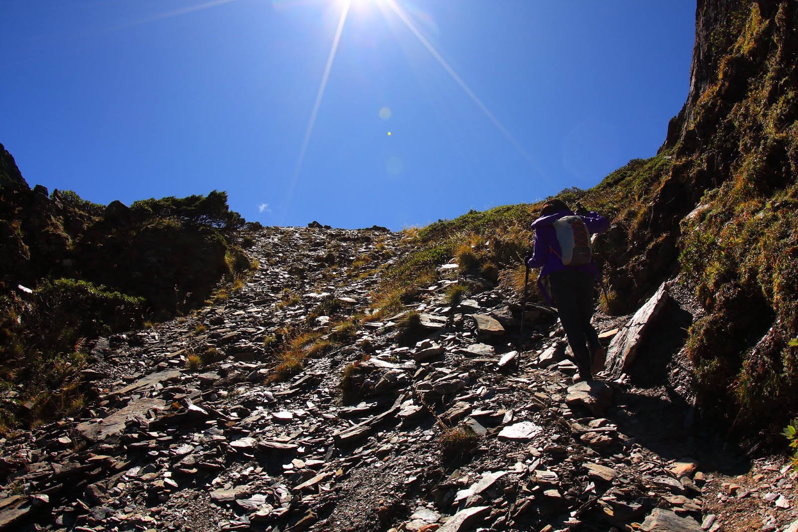 最後,通過最後水源,進入最後的碎石坡路段,感覺坡度越往上越陡,接近主東鞍部的時候,碎石地形非常破碎,真的要走好腳點,因為攀登中央尖山的人還算很多,所以路跡被踏得很扎實了,但是如果走錯路的話,碎石還真的會滑。上攀的時候覺得有一點困難,因為太陽已經照進來了,碎石會反光,很難仔細的找路,而且由下往上看,也很難清楚看見路基,真的需要花心思仔細找路跡跟腳點。