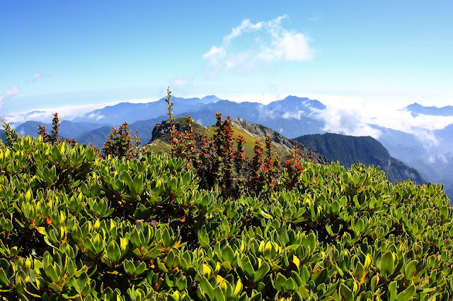 踏上南湖大山東峰向東延伸出來的這條稜線,走向花蓮縣境內,跟在圈谷內的景色很不一樣,兩旁是廣大海拔較低的中級山域。一早從山屋出發前往南湖大山東峰,通過上圈谷並翻越稜線後,迎接我們的是中央山脈東面的一片雲海。