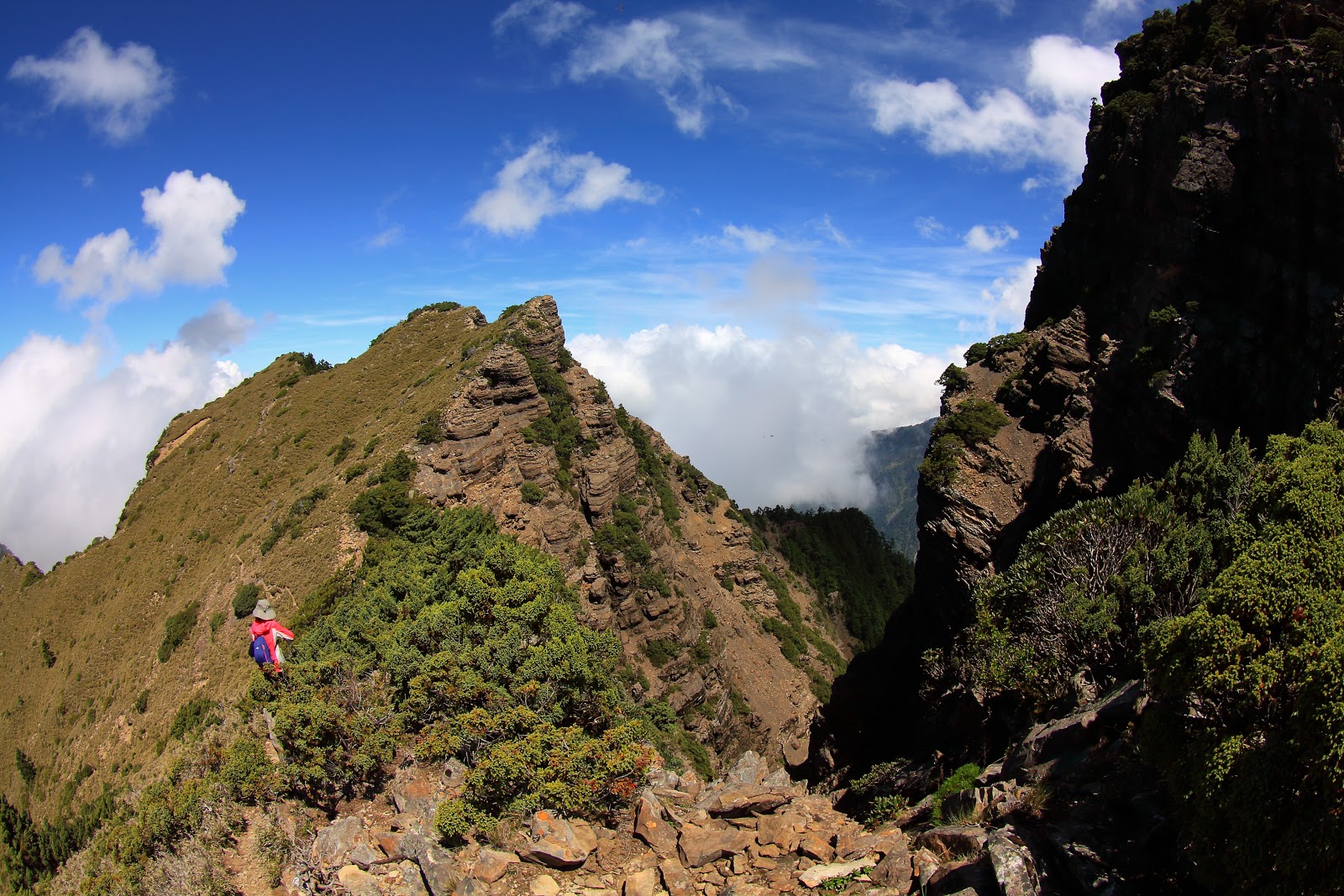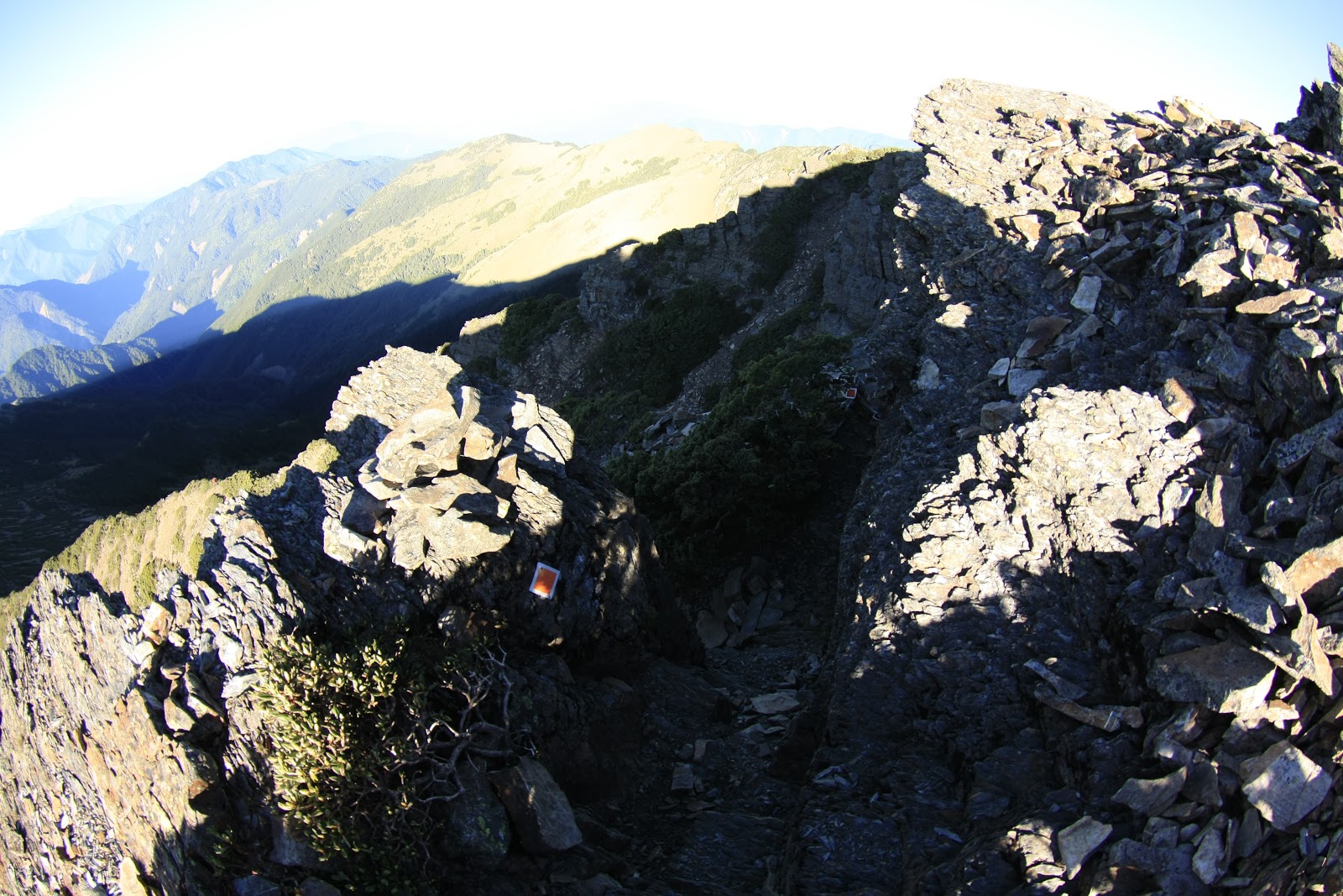 不愧是十峻的二哥,這一整片的岩壁爬起來可不簡單呢,還好今天的風勢不大,不然如此的暴露感加上強風的話,攀登起來對登山者造成的心理壓力確實不小。有幾段落差頗大的,下攀的過程中我們為了安全,什麼醜陋的姿勢都用上了,最後我們乾脆一屁股坐在岩石上,慢慢嚕下去,以前有位學長說這是沒有羞恥心的爬法。不過我想在南峰面前,人是不太需要羞恥心的。我們下到對面岩石前的鞍部,終於找到路了,這邊是跟第二登山口會合的點。找到路後我們也爬得比較安心了。