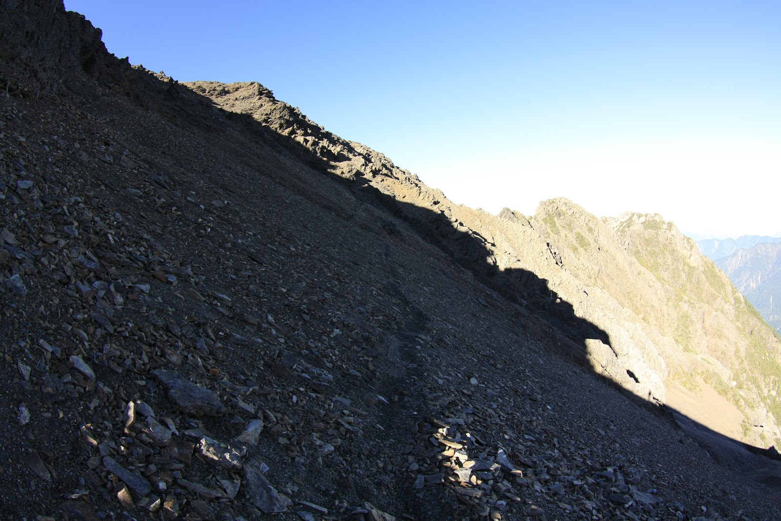 前方第一顆岩石是三叉峰延伸往南峰的稜線的障礙,昨天我們摸黑經過這裡的時候還找了一下路,差一點就爬上去了,正途是要避過這塊岩石,由左方經碎石坡腰繞過去。
