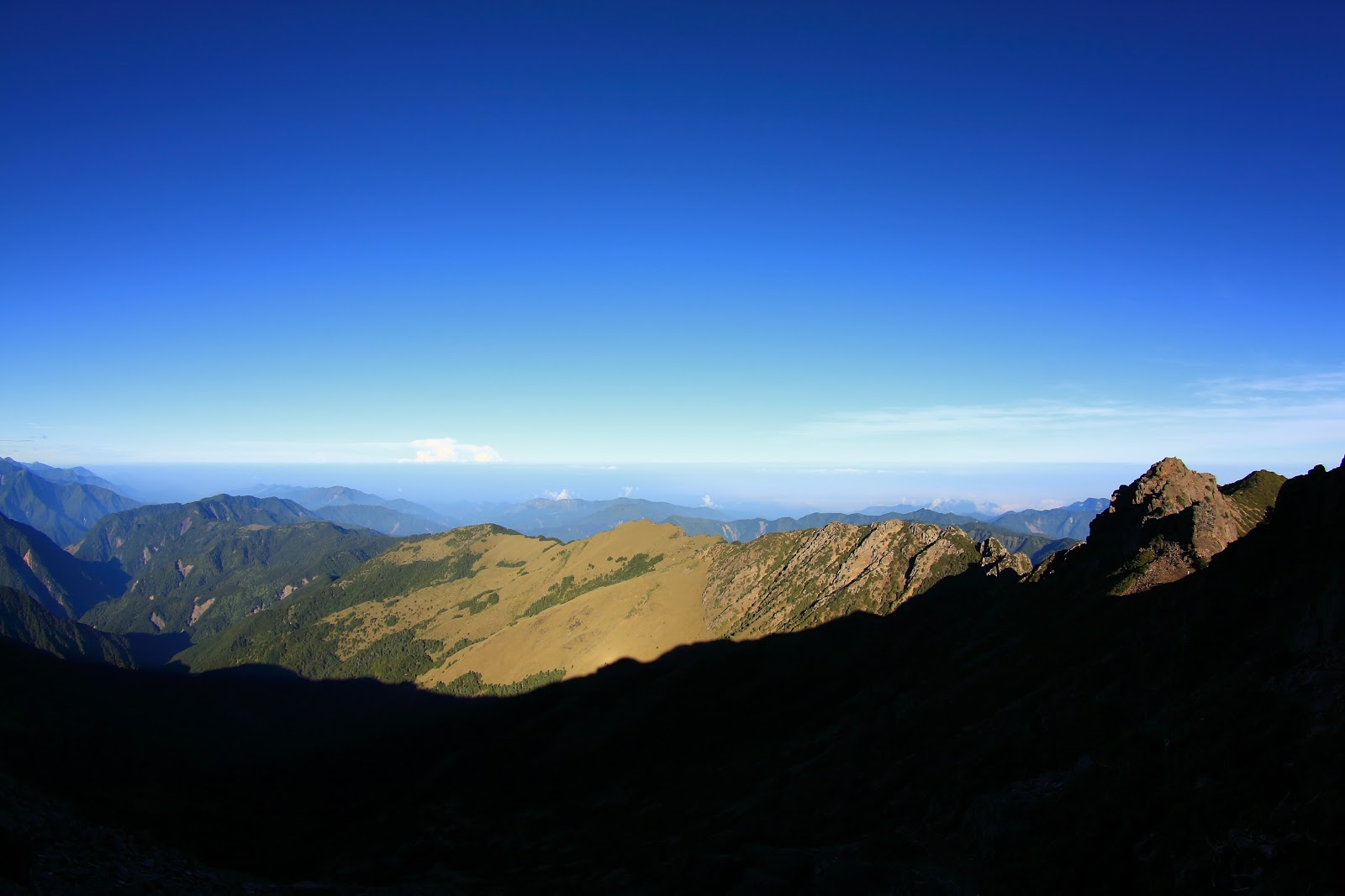 今天的早晨展望特佳,站在這裡可以遠觀四方,整個心胸好像也跟著寬大起來。 我們待到06:40就下山了。今天我們還有另外一項任務,就是南玉山。 其實,下次如果再來玉山南峰,我覺得可以站在峰頂待個一個早上欣賞台灣最高的風景。