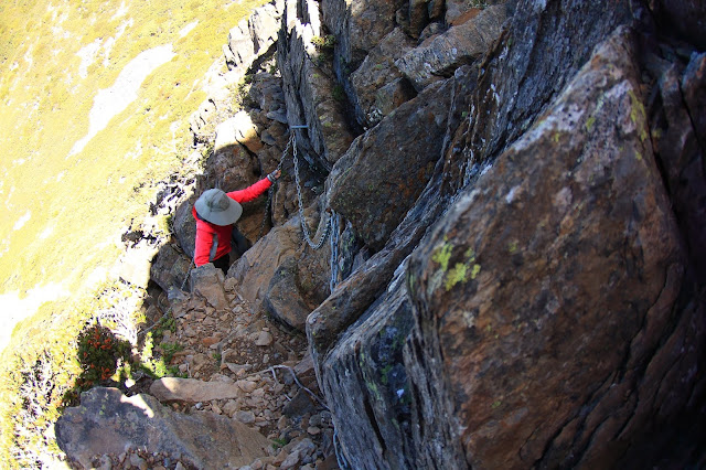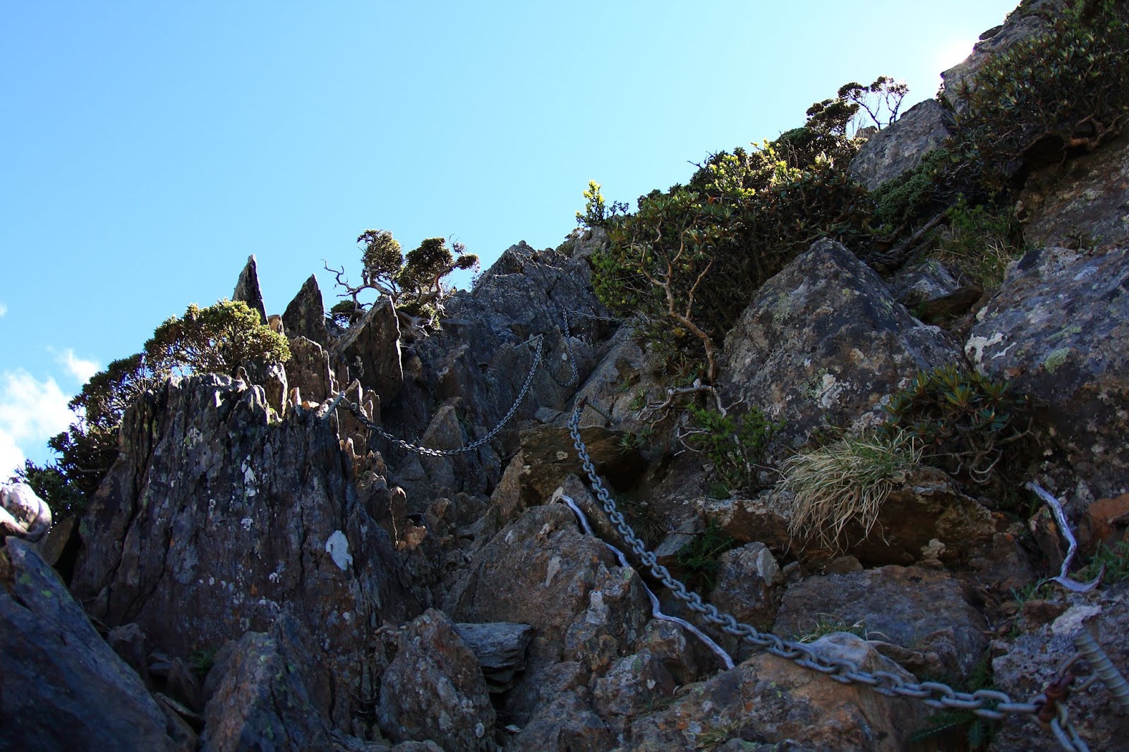 暫時告別玉山主峰,準備單攻玉山東峰,回到主東峰叉路口,由玉山稜線東側開始下切,沿途的路不是很好走,在破碎的岩石地層上,有架設鐵鏈。