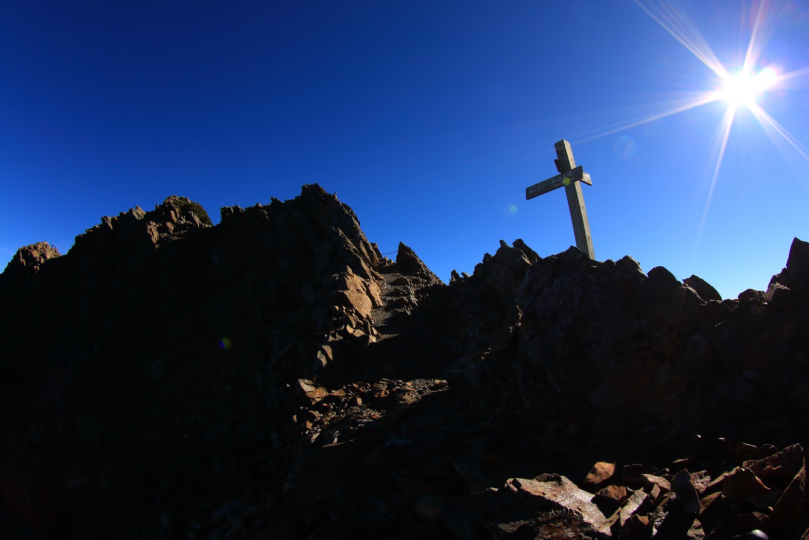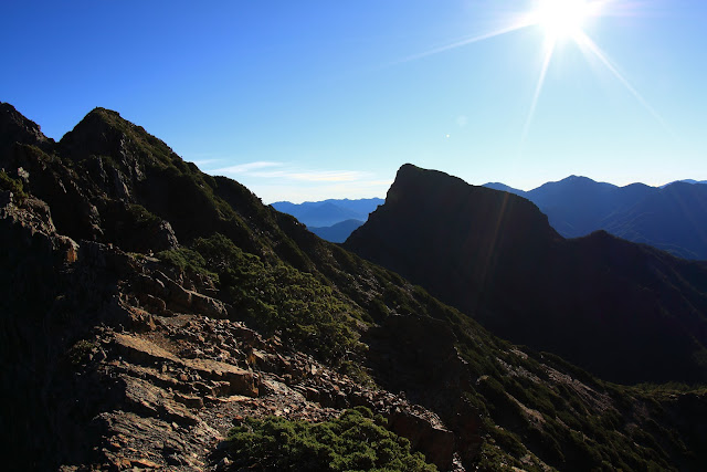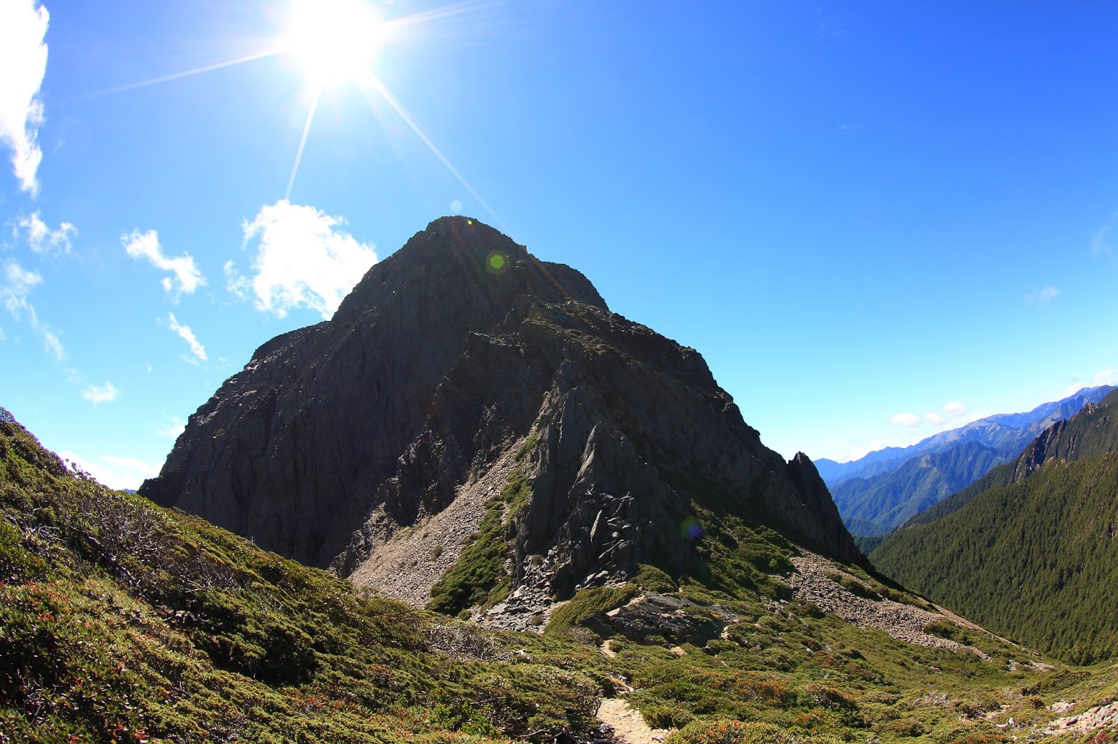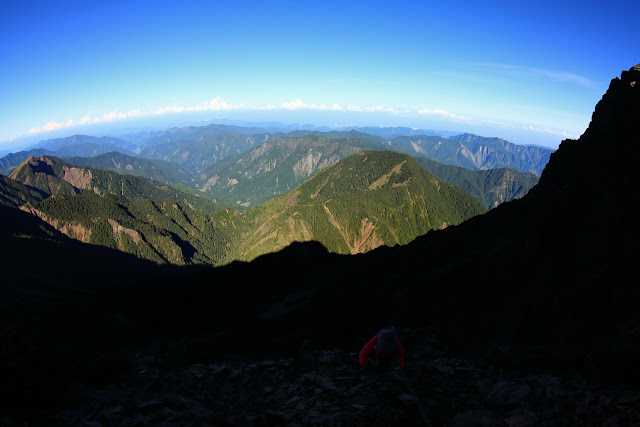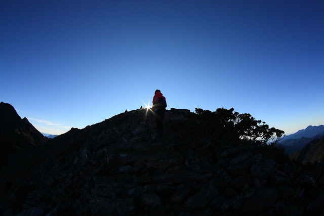 玉山南稜線,翻過大石頭。 玉山東峰,十峻之首。從背光處看過去只看得到一片黑的剪影,看起來更可怕了。