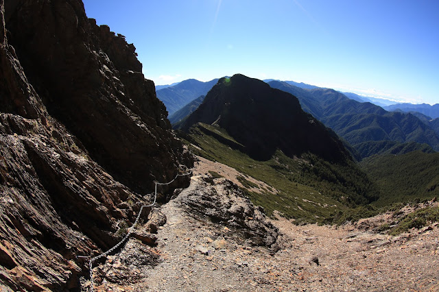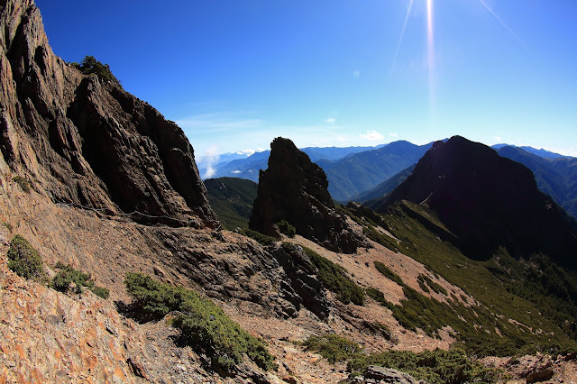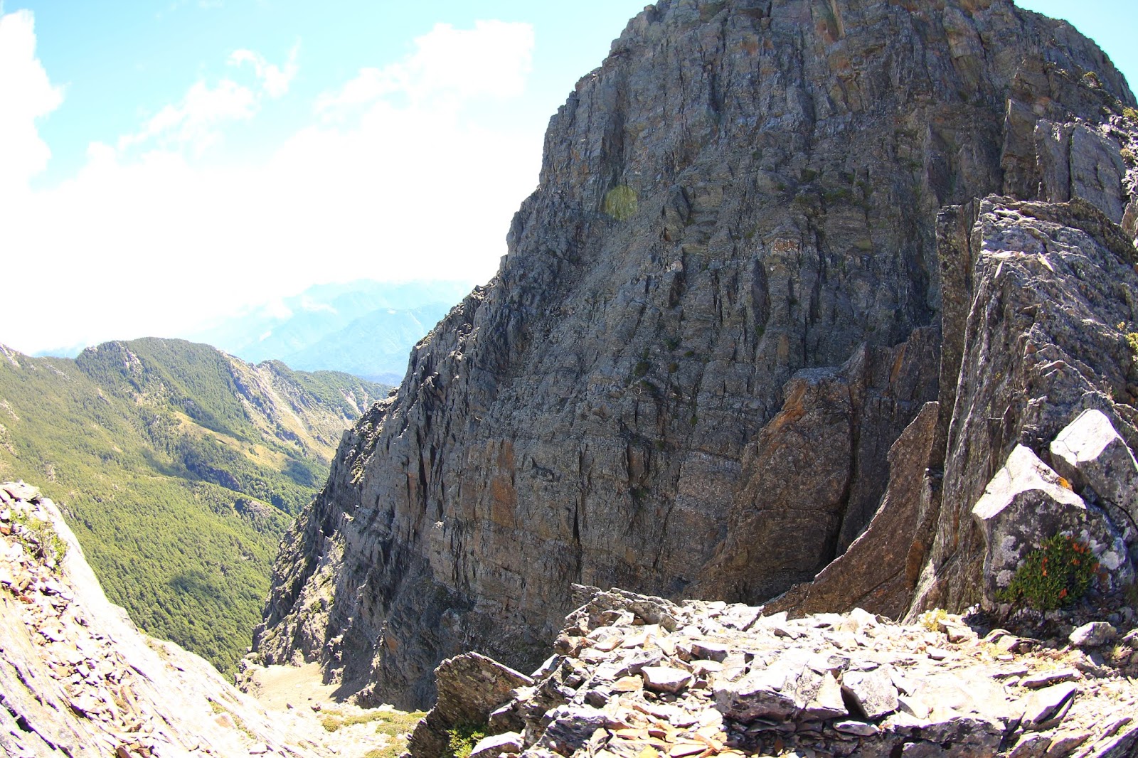 前方第一顆岩石是三叉峰延伸往南峰的稜線的障礙,昨天我們摸黑經過這裡的時候還找了一下路,差一點就爬上去了,正途是要避過這塊岩石,由左方經碎石坡腰繞過去。 回望玉山圓峰以及玉山南峰,從此處看過去,玉山南峰的地勢好像更險峻了,真難想像我們昨天才從那個碎石坡腰繞過去@@