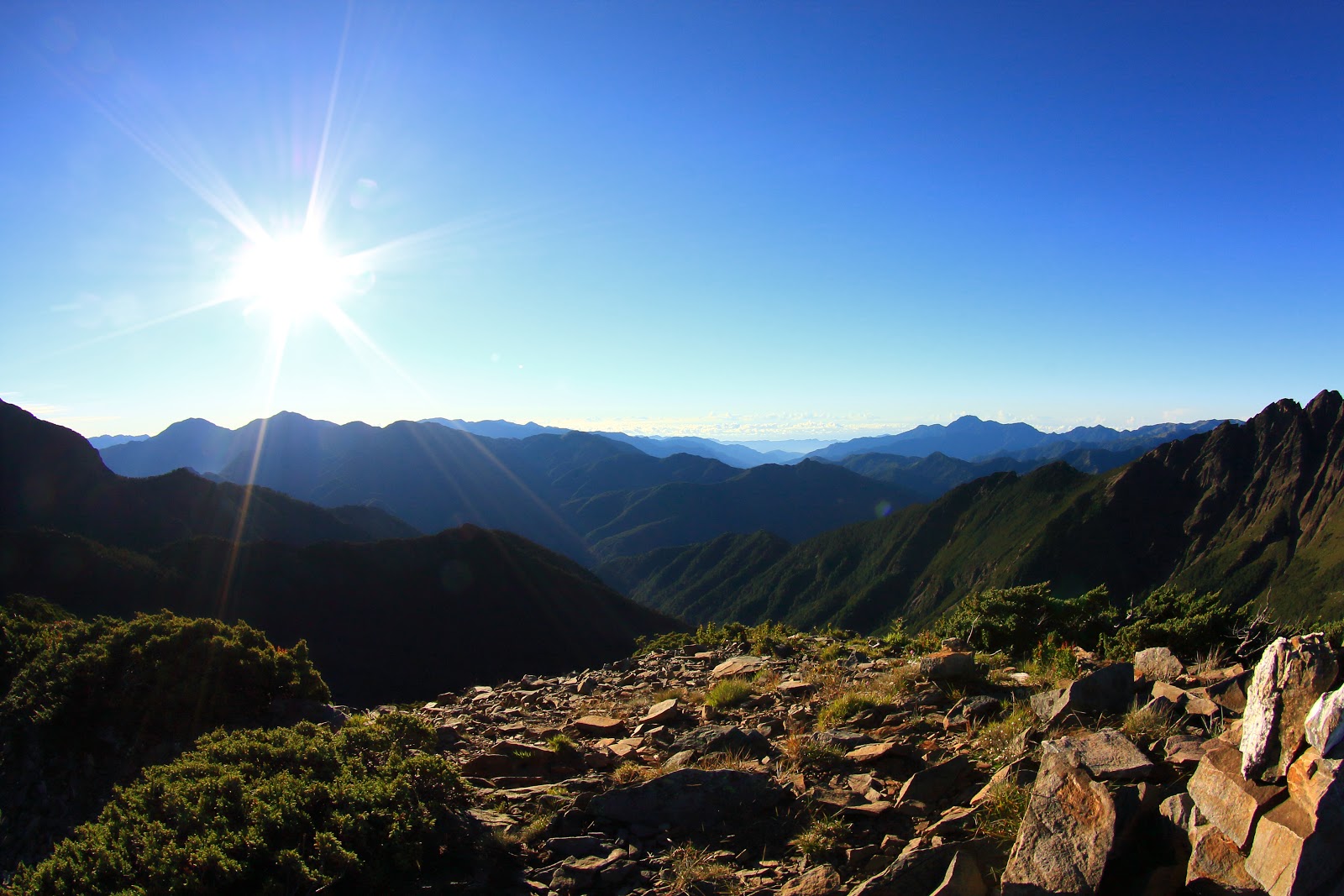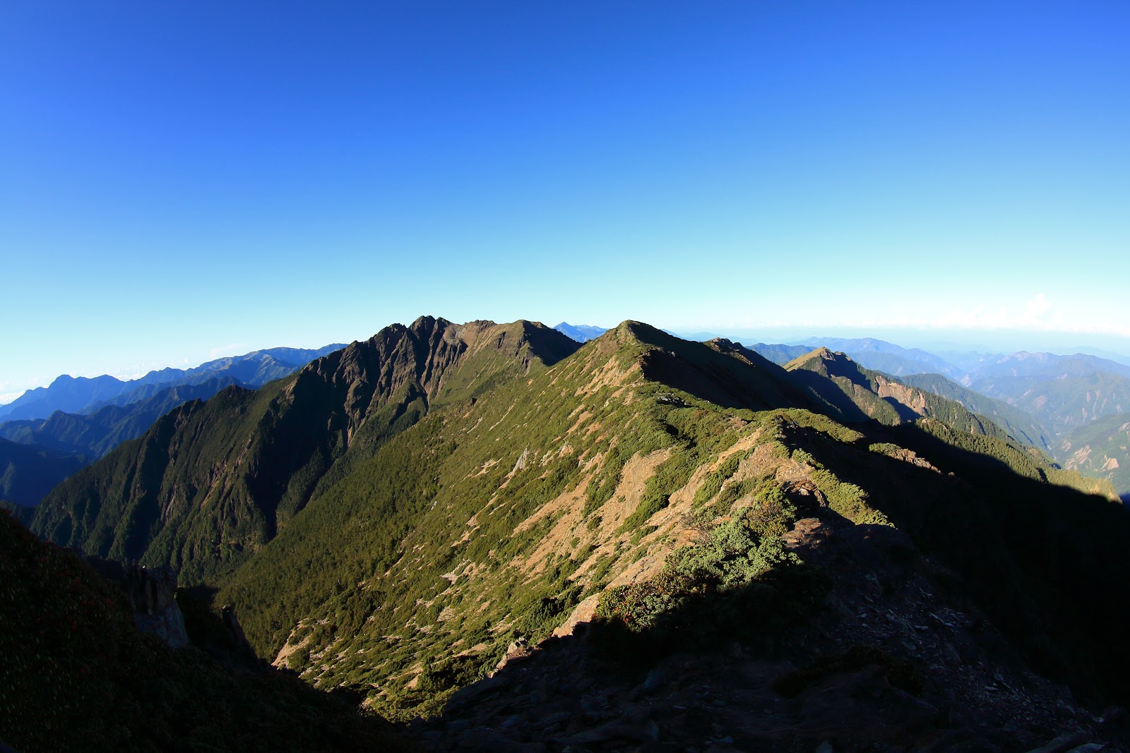 往東望去,太陽已經高高掛在中央山脈之上了。右手邊的玉山南峰,稜線延伸下去,就是我們前天去的鹿山。現在回想起來還是覺得很疲累XD。兩天前我們去了海拔最低的百岳,現在我們走在臺灣最高的稜線。