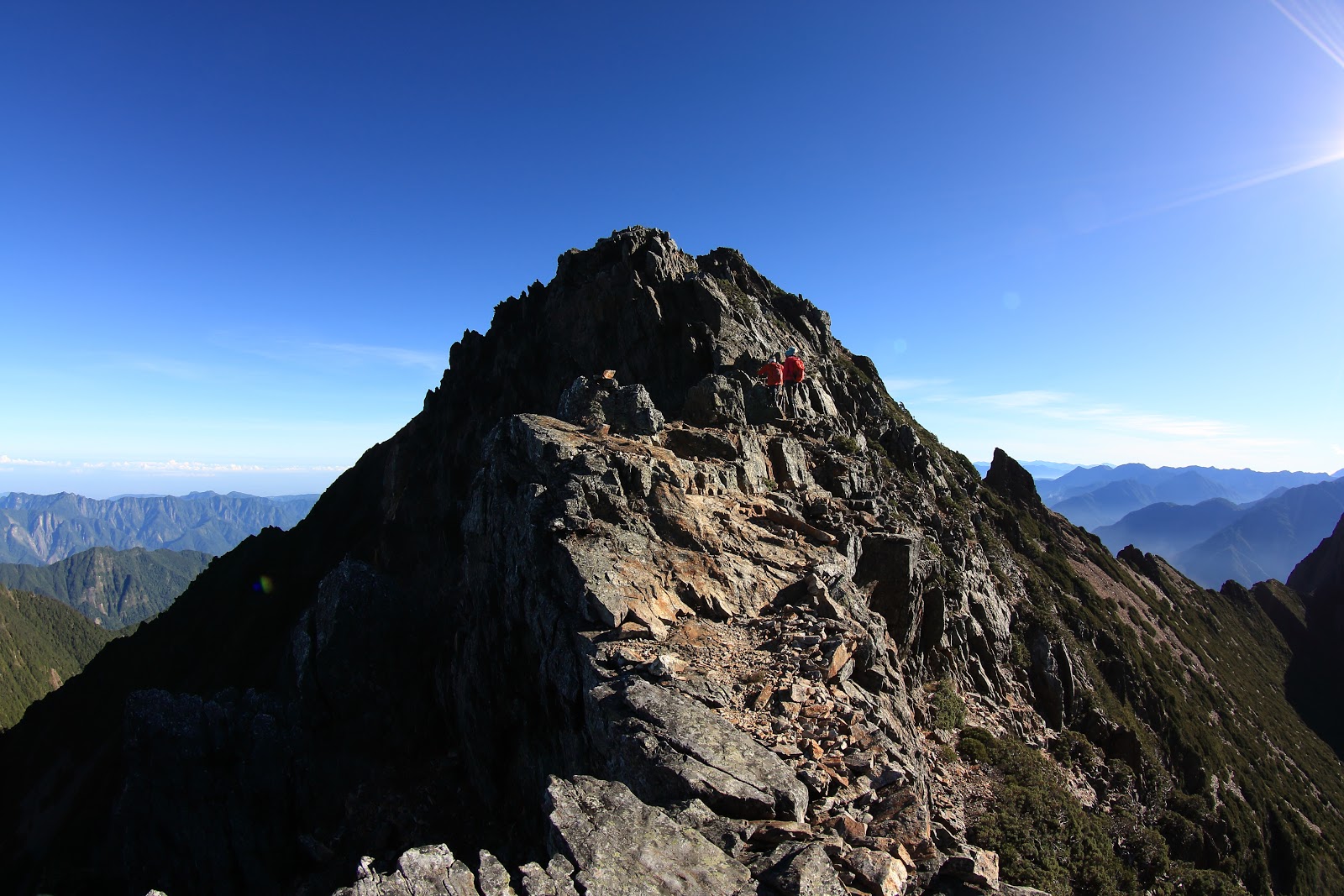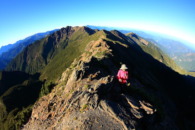 玉山南稜線上的瘦稜。左側為楠梓仙溪源頭侵蝕的碎石坡,右側為荖濃溪源頭侵蝕的碎石坡。兩側一起侵蝕所形成的破碎地形,我們沿著稜右渡過這一片岩石。