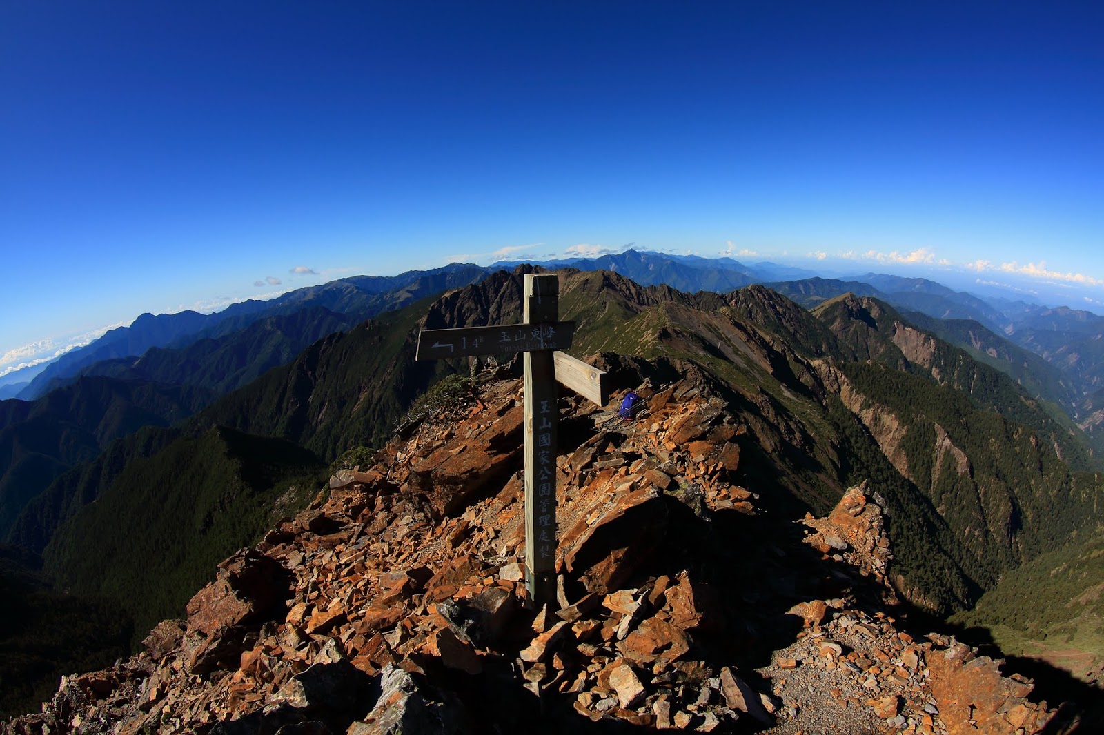 站在玉山頂,還忘四周,可見玉山北峰氣象站,往東可見玉山東峰,向南可見今天走來的南稜線以及前兩天造訪的玉山後四峰。