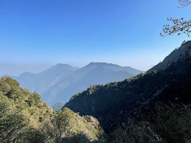 前方一點的展望很好,可以看到十八重溪谷。溪谷左邊的稜線便是清水山以及金子山連稜,稜線延伸向西巒大山、以及治茆山。溪谷左邊的山腰則是我們搭碰碰車一路進來的郡大林道。