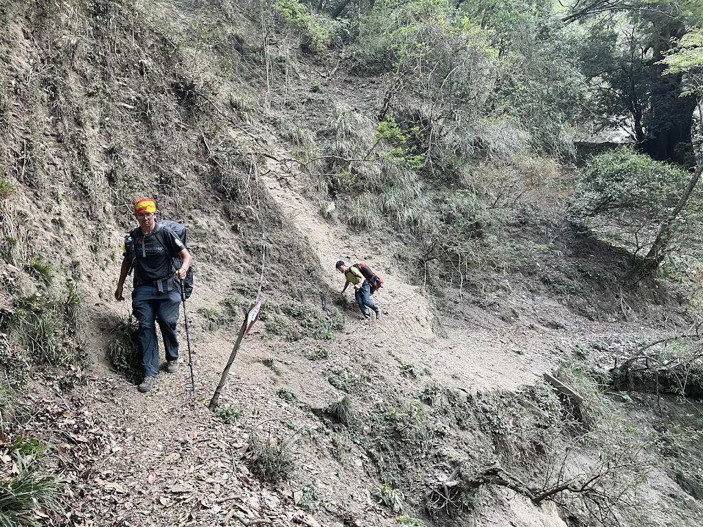 從中央金礦山屋出發,朝向八通關山前進。此處古道沿途有幾處碎石崩蹋地,但最近很久沒下雨了,這兩年也都沒有颱風登陸,看來這裡就算不下雨也是有崩塌的危險。