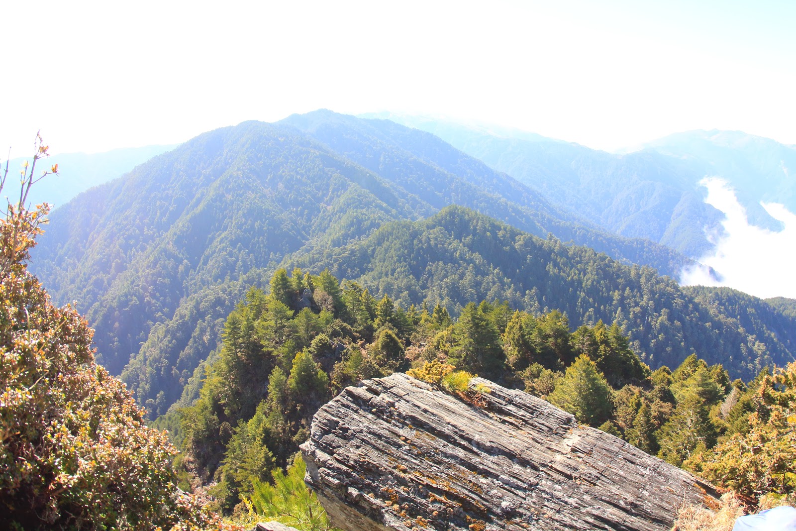 我們大概在12:10~20間陸續到達桃源營地。 因為我們從布新營地背水上來,所以我們就不下去取水了。可以好好休息到13:00 13:00出發前往連理山。連理山真的是大魔王,上升400公尺,整條新康橫斷的重點就在這裡。沿途的景色確實還不錯,很多有趣的大石頭要爬。不過我們背滿裝備,體力有一點不堪負荷,沒什麼餘力拍照了。只有一處風景絕佳的地方,我幫我妹拍了一張帥照。