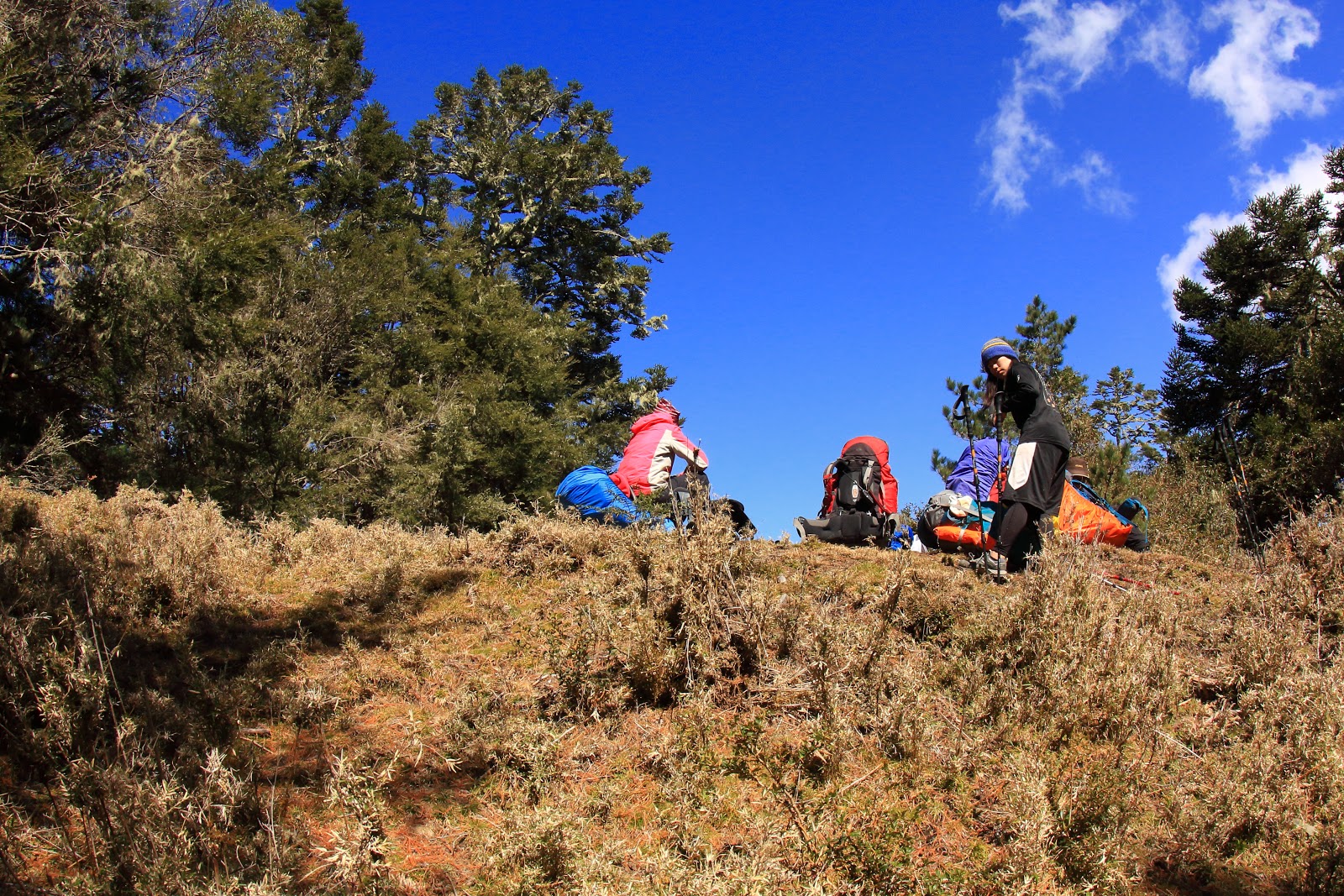 今天的天氣太好了,走起來還滿渴的,但是這邊沿途沒甚麼水源。真的要找水的話,從桃源營地往北方的溪溝下切是有水,不過冬季來回可能要50分鐘。為了節省時間跟體力,我們沒有要去取水,所有的水都是從布新營地背水鹿水過來的。