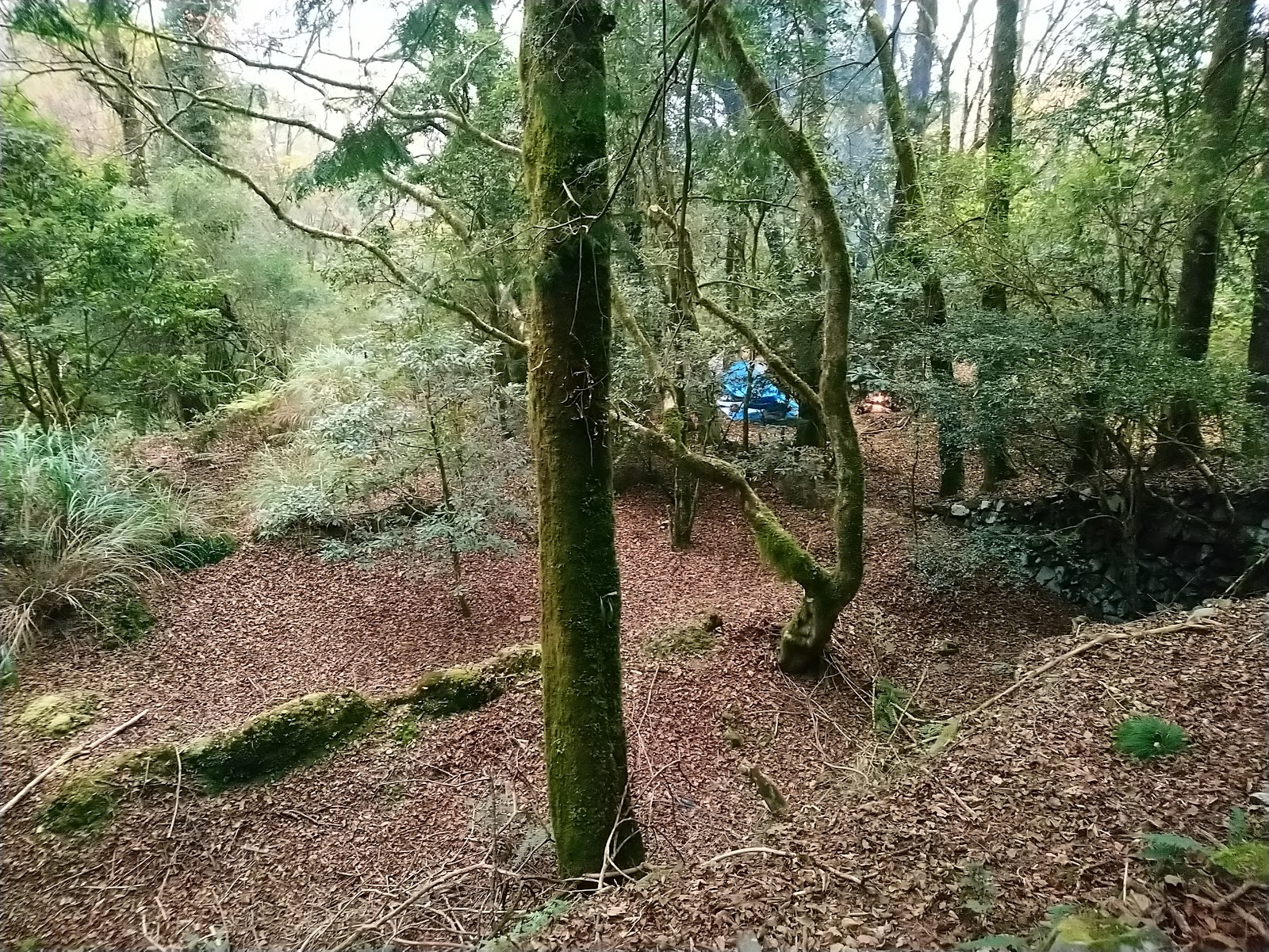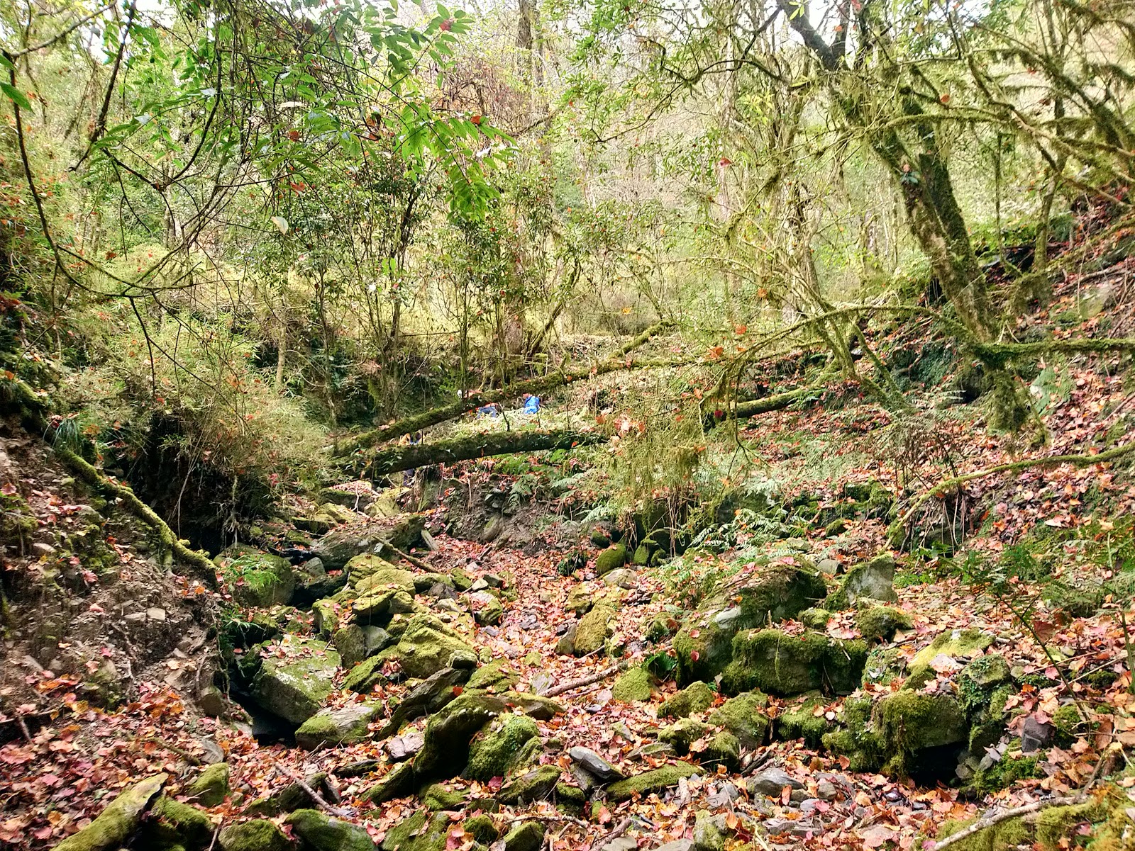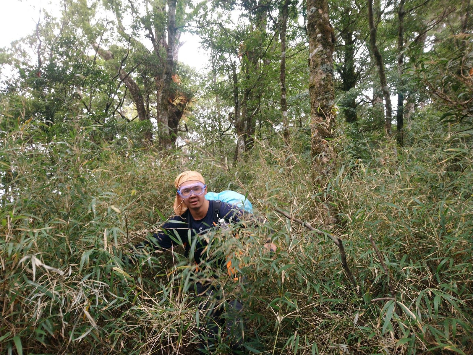 選定好今晚的營地之後,我們下切溪谷去裝今晚要用的水,並尋找傳說中的山葵,看了很多紀錄說道,原本的山葵園已經沒有東西了,這些山葵逃家往溪谷的下游遷徙去了。我們從駐在所大門下去,後探了一下原本的山葵園(或是菜園),裡面還有中央走道的遺跡,但兩旁已是草木叢生,什麼有沒了。於是我們折返回到原本的根本古道上。右轉可以見一溪溝,沿著溪溝直接往下切。只不過切了約15分鐘後還是沒看到山葵的蹤影,於是我們裝了水後便折返回駐在所了。