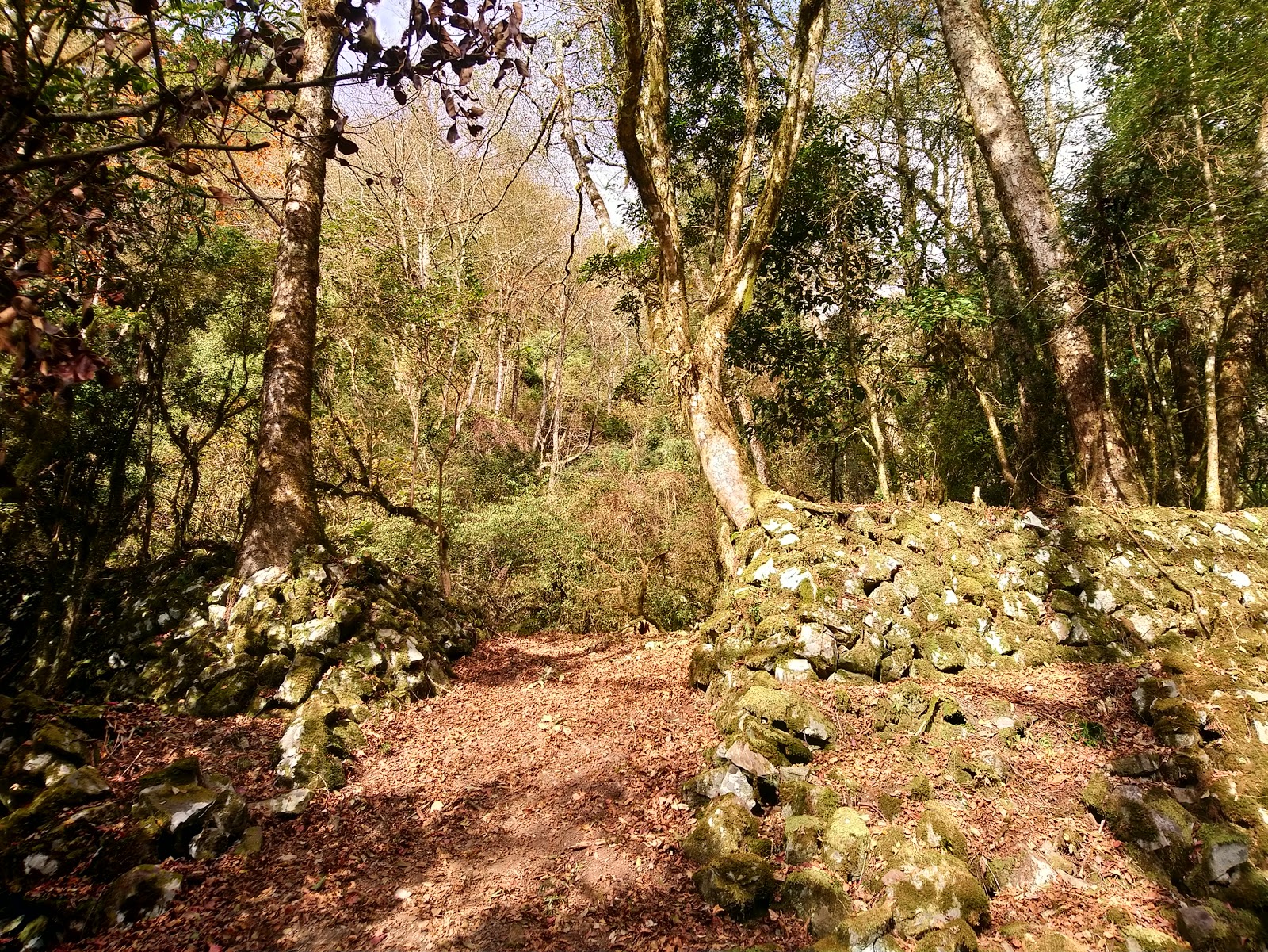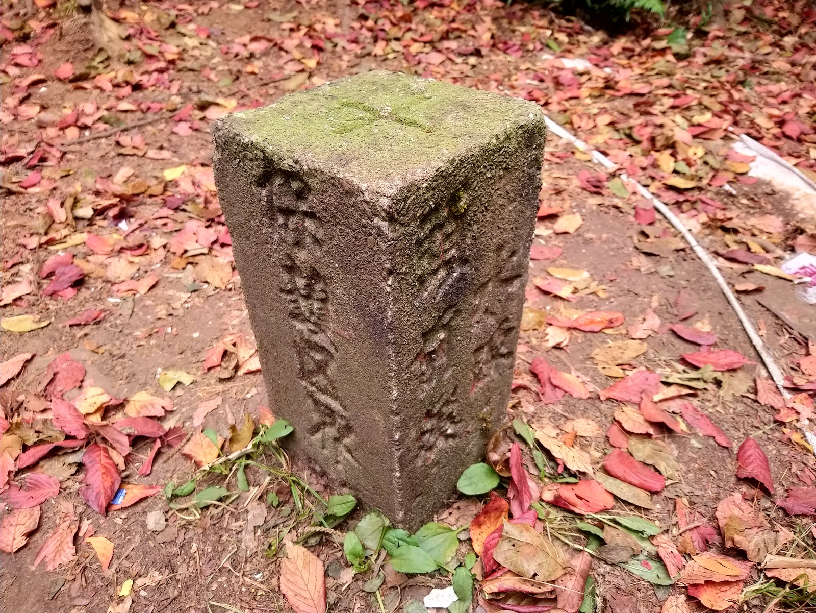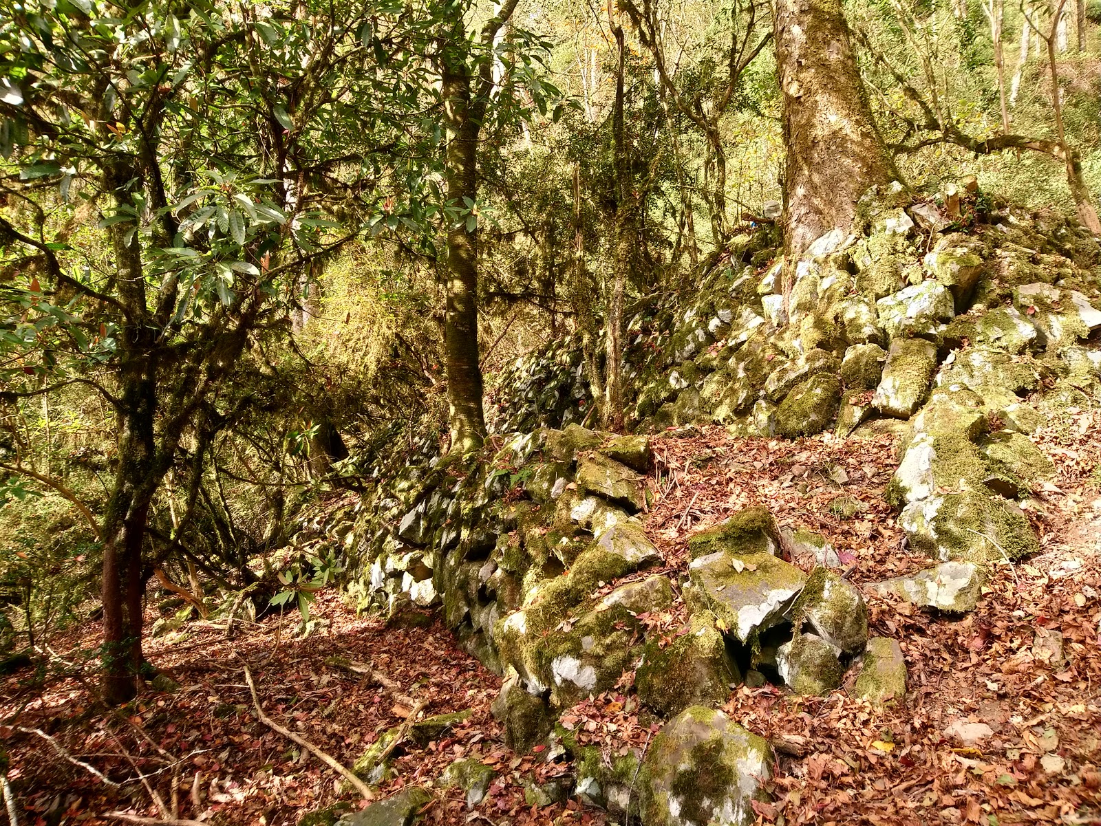 我們很怕下切切過頭,一看到有酒瓶與碎片,就趕緊停下腳步,左右尋找駐在所。後來我們在左手邊發現了一堵駁坎,確認找到駐在所了。我們找到的這堵牆是駐在所上層的右上角(由大門口看過來的話)。