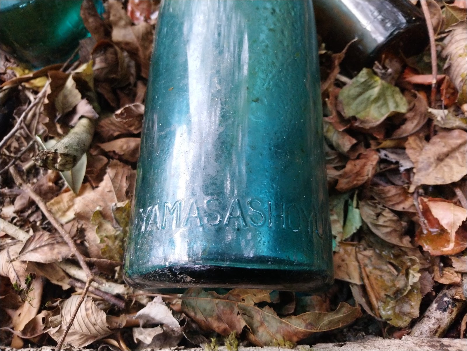 駐在所的第一層與第二層中間有一個很陡的坡道連接,這裡以前應該是階梯。第二層左邊對底部有大量的酒瓶還有醬油瓶。墨綠色的瓶子上面有標記YAMASASHOYU(山佐醬油),下山google後得知這是醬油瓶。咖啡色的瓶子,則有印製”臺灣專商局”一種,還有另一種上印著”KOTOBUKIYA Co.”