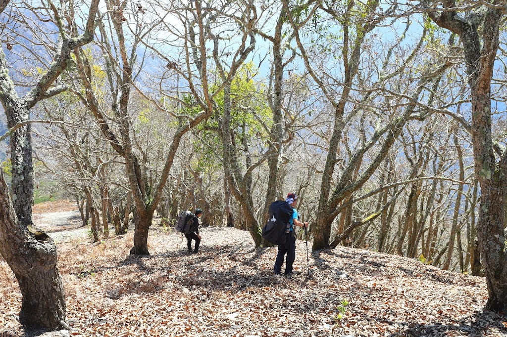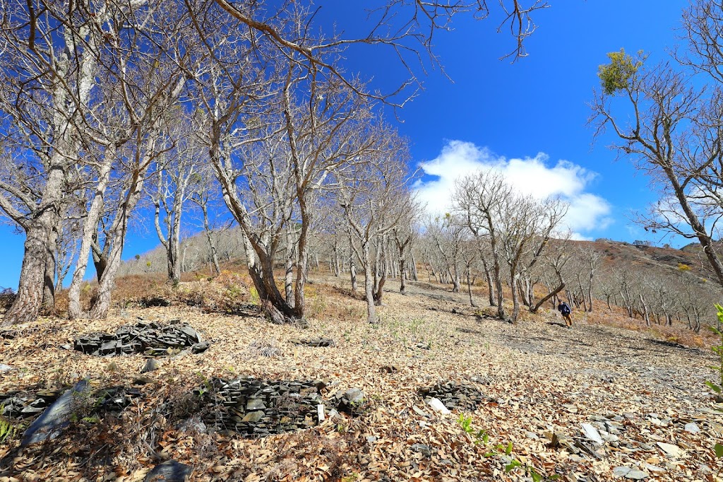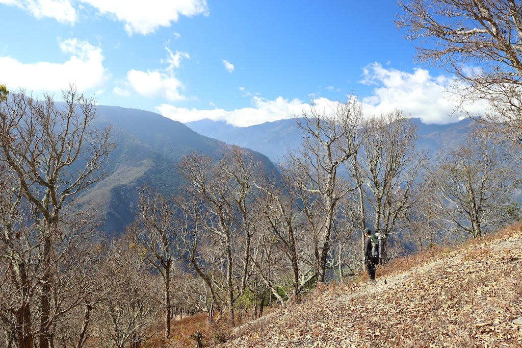 我們才從營地出發開始下切沒多久,就看到稜線上長滿了栓皮櫟,看起來是栓皮櫟純林。冬季所有樹葉都掉落了。只剩下光禿禿的樹木們站立在山坡上。這是一整片的落葉純林,這樣的景致好像只有在溫帶國家可以看到,轉眼間好像來到不同的世界一般。
