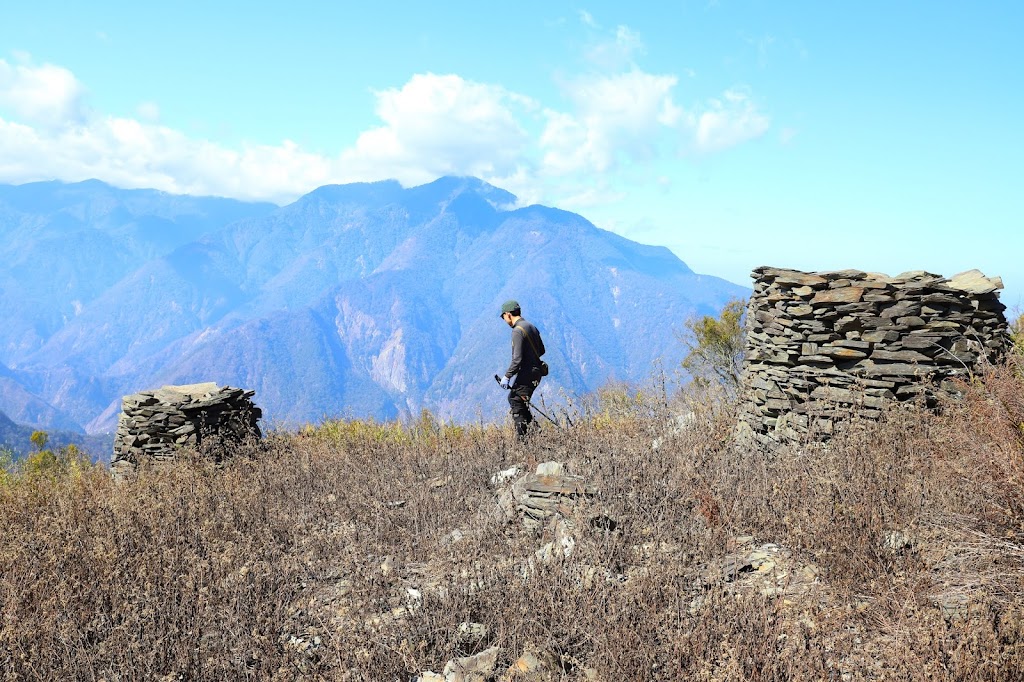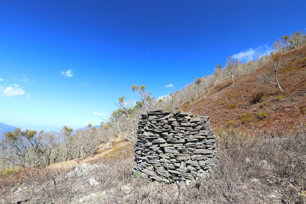 寬稜於此一分為二,偏向西方一點的支稜走過去可見一處大草坡,山坡上全是枯黃的蕨類,台電保線路就在下方了,這邊可以看到草坡上有幾堆奇怪的圓形石堆,爬了這麼多山,還是第一次看見這種人造物的遺跡,我們放下重裝下去一探究竟。