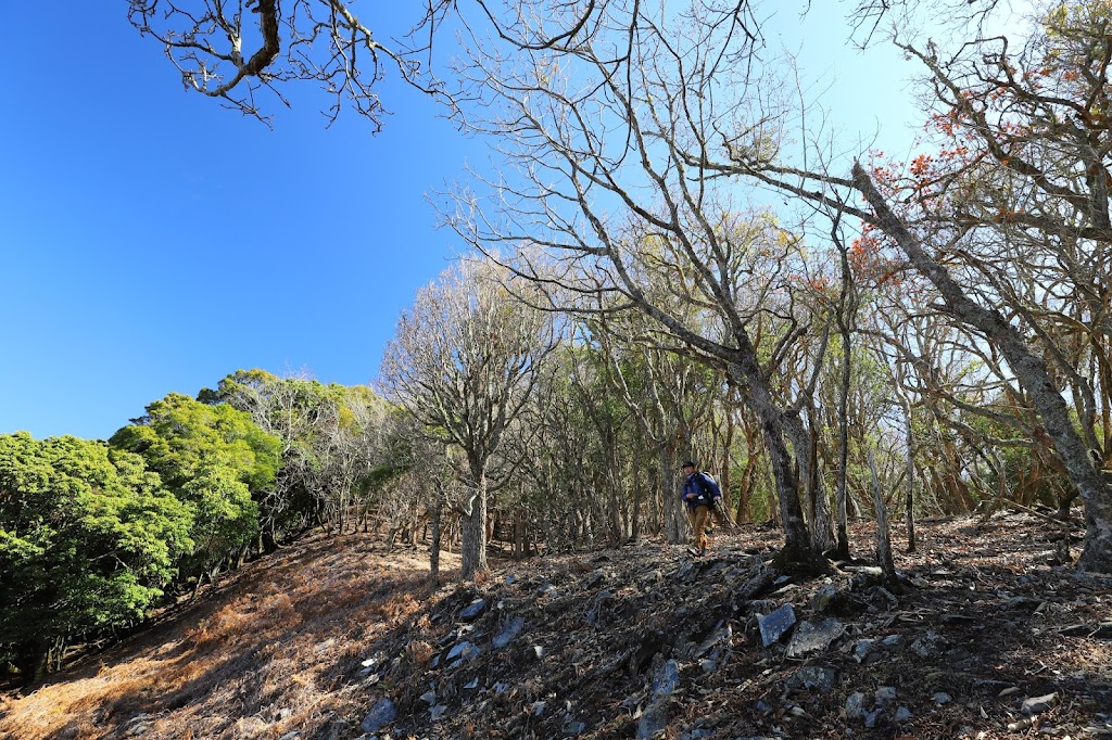 翻過了昨天我們看夕陽的枯黃蕨海,沿著稜線準備下切。不久,發現到整條稜線是栓皮櫟純林。
