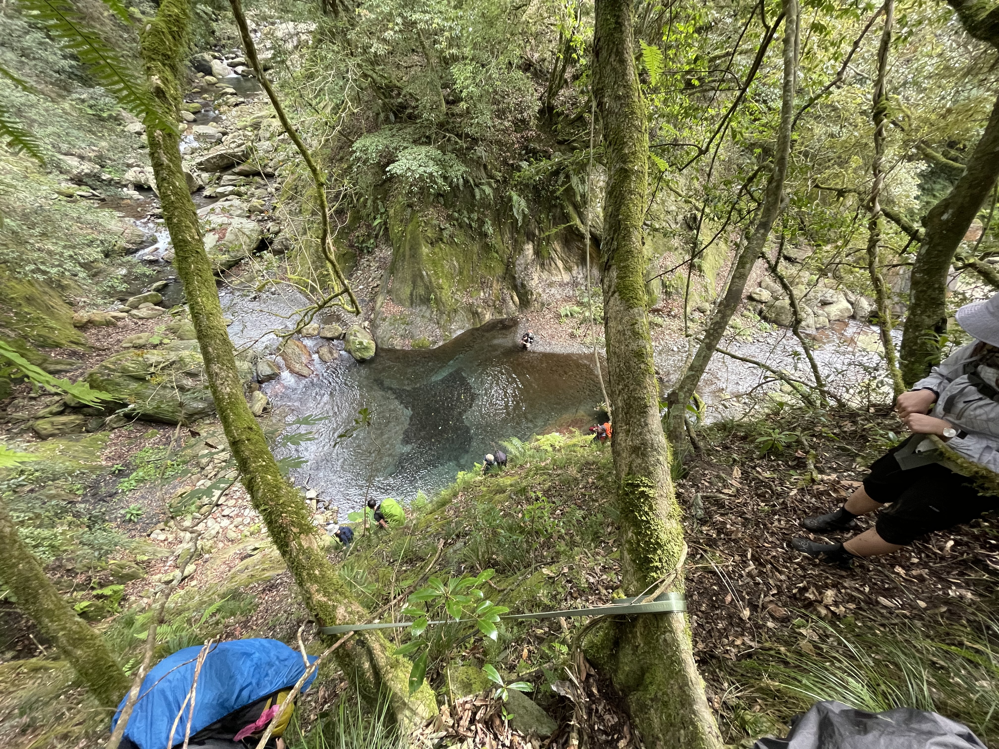 16:30 溪左高地,研判我們今天應該無法走上駁坎區了,決定在此地迫降。距離前面第三高繞點還需要約20分鐘路程